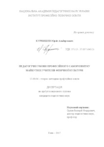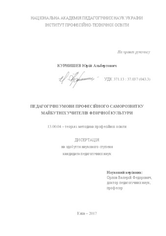- Курнишев, Юрій Альбертович (2017) Pedagogical conditions of professional self-development of future teachers of physical education Dissertation candidate thesis, Інститут професійно-технічної освіти.