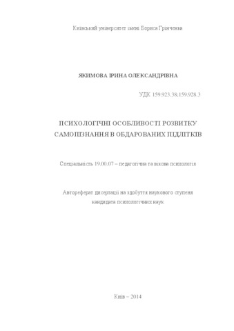Dissertation for the degree of candidate of psychological sciences, specialty 19.00.07 – pedagogical and age psychology. – Kyiv University named after Borys Grinchenko, Kiev, 2014. The dissertation is devoted to the research of psychological characteristics of gifted adolescents’ self-knowledge development. On the basis of theoretical analysis the model of gifted adolescents’ self-knowledge development is proved. The psychological peculiarities of gifted adolescents’ self-knowledge development are experimentally identified. The levels (biological individual, social individual, personality) and the criteria (orientation, temporal characteristics, cognitive structure, direction of self-knowledge) of gifted adolescents’ self-knowledge development are defined. The program of gifted adolescents’ self-knowledge development is grounded, developed and tested. The effectiveness of the program is proved by the positive dynamics of gifted adolescents’ reflexivity and self-awareness enhance. Based on the results of the research the recommendations for educators, psychologists and students aimed at gifted adolescents’ self-knowledge activation are developed.