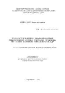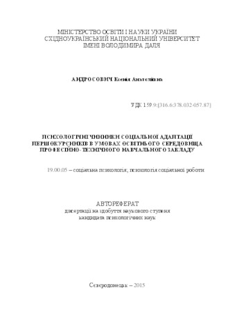 Dissertation for a candidate degree in psychological sciences, specialty 19.00.05 - social psychology; psychology of social work. – Volodymyr Dahl East Ukrainian National University of the Ministry of Education and Science of Ukraine. – Severodonetsk, 2015. The dissertation research is dedicated to the study of psychological factors of first-course students’ social adaptation in terms of a vocational institutions educational environment. It was found that social adaptation is the process and the result of active adaptation of an individual to the group, to the terms of social environment of vocational schools and to social life conditions which are in the process of changing or has already changed. The main psychological factors of successful social adaptation of first-course students in terms of vocational institution educational environment were established. They are: changes of mental states self-rating indicators (reduction of aggression, anxiety, frustration and rigidity), interpersonal relationships and level of vitality (the change of social status for more favorable) and changing attitudes to their learning conditions in educational institution (characteristics of educational and production processes organization, attitude and influence of an institution administration, special features of interpersonal relationships, the contact with relatives and friends). The implementation of the developed program of training sessions for first-course students’ social adaptation in terms of vocational institutions educational environment contributed to lowering indicators of aggressiveness, anxiety, frustration, rigidity. It facilitated the ability to effective adaptability developing, improved acceptance of oneself and social environment, improved overall emotional state of participants. The rates of emotional comfort and the overall level of social adaptation increased.
