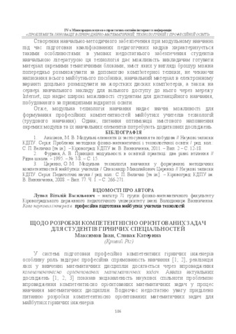 - Словак, К. І. and Максимов, І. І. (2017) As for the development of competence-oriented tasks for students of mining specialties In: Проблеми та інновації в природничо-математичній, технологічній і професійній освіті : матеріали IV Міжнародної науково-практичної онлайн-інтернет конференції . РВВ КДПУ ім. В. Винниченка, м. Кропивницький, Україна, pp. 106-108.