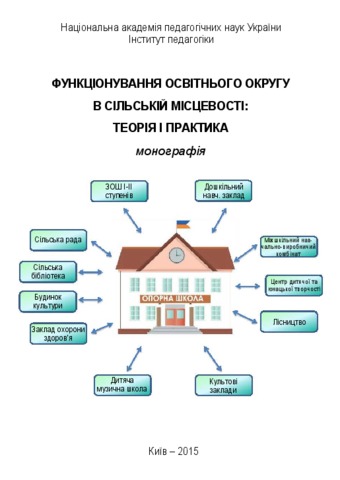 The monograph reveals the methodological principles of the functioning of the educational district as an open pedagogical system, and deepens the theory of modeling of the educational district, based on the principles of integration and interaction. The submitted materials reveal the trends in educational districts functioning within the network of secondary education, define methodological approaches to the design of new structures and present the component analysis of the educational district model, including organizational, administrative, didactic, methodical, value, etc .; the program for implementing of the educational district model and other methodological materials for practical use are developed. A detailed description of the variational models of educational districts introduced in pedagogical practice is presented, and relevant results are presented to confirm their effectiveness. Scientific theoretical developments, applied research, outlined in the monograph is intended for researchers, heads of departments of education, directors of secondary schools, practical teachers for implementing of new ideas, developing theories, designing models and programs aimed at improving of conditions for the functioning of educational districts, institutions of general secondary education in rural areas and their further development.