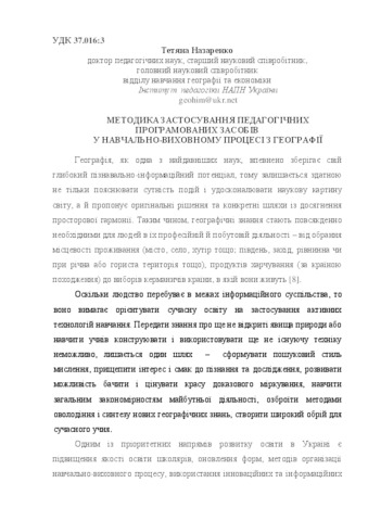 - Назаренко, Тетяна Геннадіївна (2017) Methodology of application of pedagogical programmable means in the educational process of geography Комп'ютер у школі та сімї, 1 (137). pp. 29-35. ISSN 2307-9851