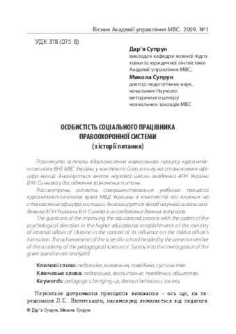 - Супрун, М.О. (orcid.org/0000-0002-4198-9527) and Супрун, Д. М. (orcid.org/0000-0003-4725-094X) (2009) Personality of the social worker of the law-enforcement system (from the history of the issue) Вісник Академії управління МВС, 1 (16). pp. 189-198.