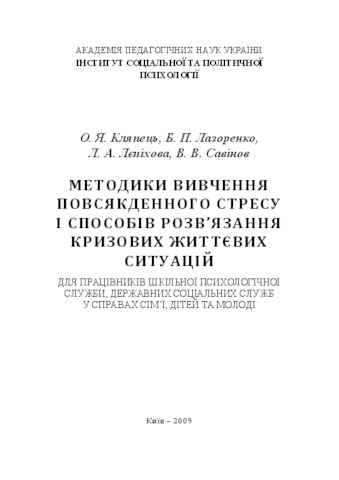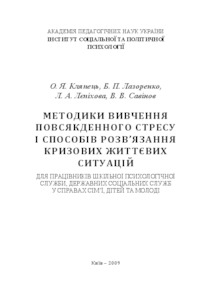 The collection, which was prepared for the tasks of the Intersectional Integrated Program "Nation's Health" for 2002-2011, presents a large range of common and little-known methods for diagnosing personal readiness for experiencing stressful situations and crisis situations, assessing the level of psychological "safety" of a child and an adult in stress and crisis situations, both personal and family. The attention is paid to the methods of studying the identity of a young person, the study of self-esteem, socio-psychological competence, coping behavior and other aspects of the psychology of personality, experiencing extreme life situations. For employees of the school psychological service, state social services for family, children and youth, as well as teachers, parents, all who are self-help in overcoming everyday stresses and crisis life situations.
