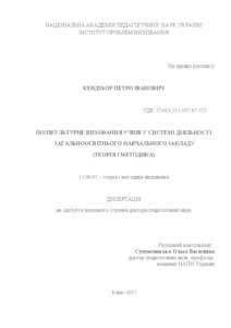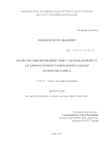 - Кендзьор, П.І. (2017) Multicultural Education of School Students in the System of Activities of General Educational Institution (Theory and Methods) Masters thesis, Інститут проблем виховання.