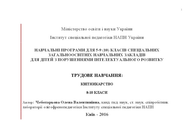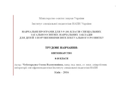 - Чеботарьова, О. В. (orcid.org/0000-0002-4560-3708) (2016) Educational programs for 5-9 (10) classes of special general educational institutions for mentally retarded children "Labor studies": Floriculture. Grades 8-10 [Teaching Resource]