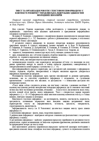 - Шевчук, Л.М. (2017) Content and organization of work with textual information in the context of developing administrative and leadership skills of primary school students In: XІІІ Міжнародна конференція «Стратегія якості у промисловості і освіті» . XІІІ Міжнародна конференція «Стратегія якості у промисловості і освіті» (5-8 червня 2-томах. Том І. Упорядники: Хохлова Т.С, Кімстач Т.В. – Дніпро-Варна, 2017. – 444 с., м. Дніпро, Ураїна - м. Варна, Болгарія, pp. 300-304. ISBN 978-966-7433-13-1