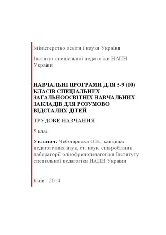 - Чеботарьова, О. В. (orcid.org/0000-0002-4560-3708) (2014) Educational programs for the 5-9 (10) classes of special general educational institutions for mentally retarded children. Labor studies Grade 5 [Teaching Resource]