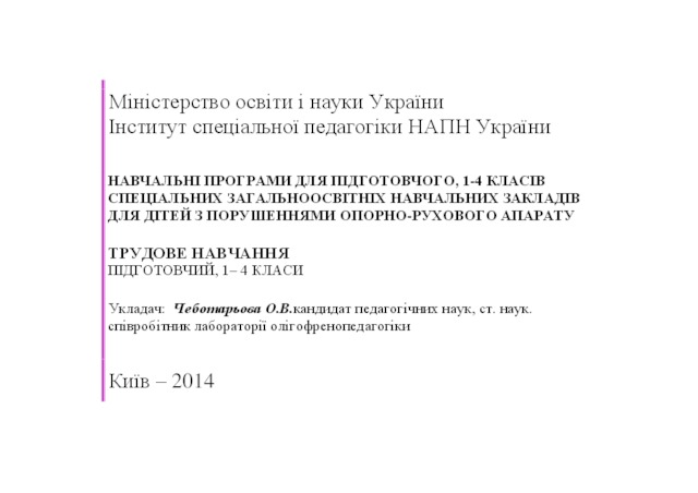 - Чеботарьова, О. В. (orcid.org/0000-0002-4560-3708) (2014) Educational programs for the preparatory, 1-4 classes of special general educational institutions for children with musculoskeletal disorders. Labour studies. Preparatory, 1-4 gradess [Teaching Resource]