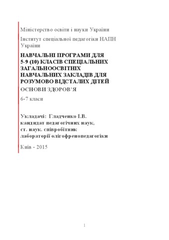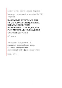 - Гладченко, І. В. (orcid.org/0000-0002-2013-8053) (2015) Educational programs for 5-9 (10) classes of special general educational institutions for mentally retarded children. Basics of Health. Grades 6-7 [Teaching Resource]