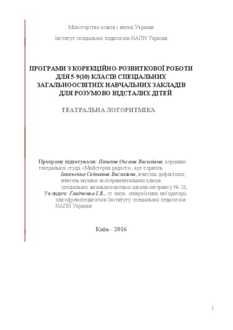 - Папета, О.В., Іванченко, С.В. and Гладченко, І. В. (orcid.org/0000-0002-2013-8053) (2016) Programs for corrective-developing work for 5-9 (10) classes of special general education schools for mentally retarded children. "Theater logorhythmics" [Teaching Resource]