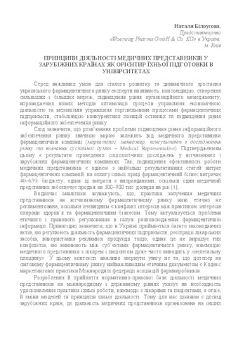 The abstracts describes the principles of the activities of medical representatives in foreign countries and the guidelines for their training in higher education institutions in Europe.