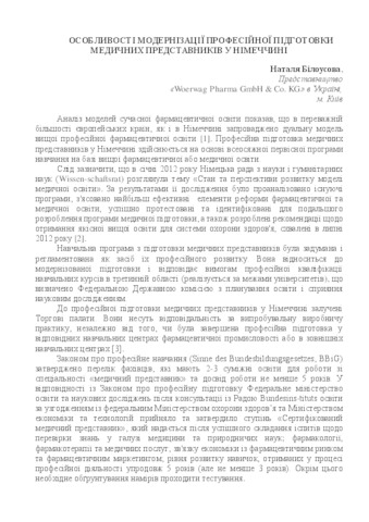 - Білоусова, Наталя Анатоліївна (2017) Features of modernization of vocational education of medical representatives in Germany In: Педагогічна компаративістика і міжнародна освіта - 2017 . Педагогічна думка, м. Київ, Україна, pp. 30-31. ISBN 978-966-644-365-9