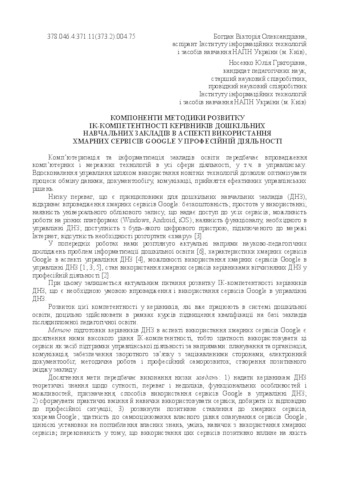 - Богдан, В.О. and Носенко, Ю.Г. (2017) Components of the technique for developing the IC-competence of preschool managers in terms of using Google cloud services in their professional activities In: Матеріали Звітної наукової конференції Інституту інформаційних технологій і засобів навчання НАПН України . Інститут інформаційних технологій і засобів навчання НАПН України, м. Київ, Україна, pp. 136-139.