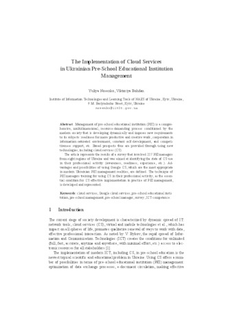 - Nosenko, Yuliya and Bohdan, Viktoriya (2017) The Implementation of Cloud Services in Ukrainian Pre-School Educational Institution Management ICT in Education, Research and Industrial Applications. Integration, Harmonization and Knowledge Transfer (1844). pp. 451-458. ISSN 1613-0073