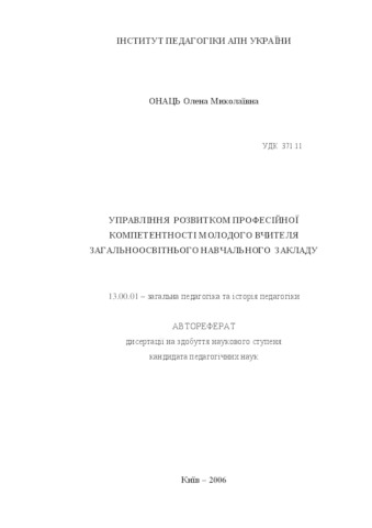 - Онаць, Олена Миколаївна (2006) Management of development of a young teacher professional competence at compulsory school Dissertation candidate2 thesis, Інститут педагогіки.