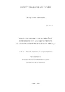 Dissertation on getting a scientific candidate degree in Pedagogics in speciality 13.00.01. general pedagogics and the history of pedagogics Ukrainian Pedagogics Institute APS, Kyiv, 2006. Dissertation is dedicated to the problem compulsory school. A complete analysis of a stage of elaborating the problem in psychological pedagogical, sociological, methodical literature and practice has been made. Contents of the core and components of the definition "a young teacher professional competence", author's definition of the term development of a young teacher professional competence", " management of development of a young teacher professional competence" are given. Textual norm model of a young teacher professional competence, structural model of development of a young teacher professional competence and mechanism of managing accompaniment of development are worked out. Innovative forms and methods of scientific-methodical work are enlighted. The Web-site to help young teachers through Ukraine was worked out. Main results of work were put into practice system in compulsory schools in Ukraine in Educational Board and regional method’s centre, in Postgraduate Education Institute, Regional Management of Education and Science, City Governing and Scientific-Methodical Centre, Ukrainen School Heads Association.