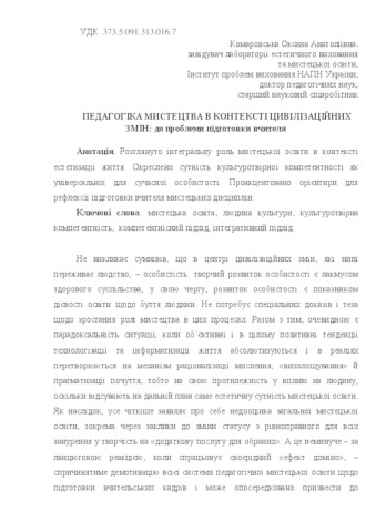 - Комаровська, О.А. (2016) Pedagogy of art in the context of civilizational change: the problem of teacher preparation Професійна мистецька освіта і художня культура: виклики ХХІ століття. pp. 1-9.
