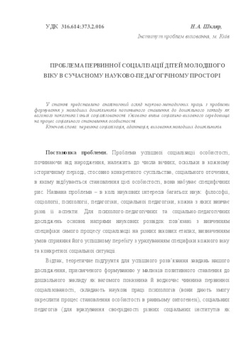 - Шкляр, Н.А. (2016) Problem primary socialization of young children in modern scientific and educational space Теоретико-методичні проблеми виховання дітей та учнівської молоді (19). pp. 366-378. ISSN 2308-3778