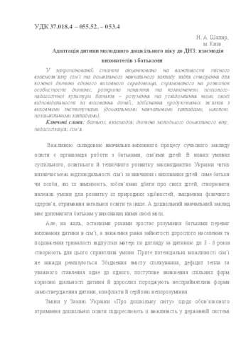 - Шкляр, Н.А. (2016) Adaptation of the child of preschool age in the preschool: interaction with parents educators Теоретико-методичні проблеми виховання дітей та учнівської молоді (20). pp. 324-336. ISSN 2308-3778