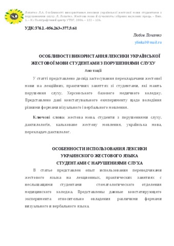 - Лопатко, Любов Анатоліївна (2006) Features of the Ukrainian sing language by Students with hearing impairments Жестова мова й сучасність (1). ISSN 966-8663-16-0