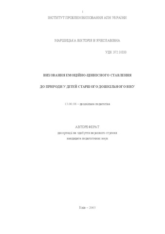 - Маршицька, В.В. (orcid.org/0000-0002-7072-8844) (2002) Upbringing of emotional and valuable attitude to the nature of children of elder preschool age Dissertation candidate2 thesis, Інститут проблем виховання.