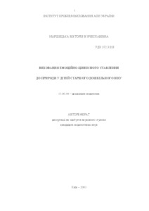Dissertation focuses on the issues of upbringing of emotional and valuable attitude to the nature of children of elder preschool age. The techniques for upbringing of emotional and valuable attitude to the nature of children of elder preschool age were developed and experimentally proved; criteria, indicators, stages and means of educational impact were revealed. The efficiency of experimental techniques for upbringing of emotional and valuable attitude to the nature of children of elder preschool age is proved to be ensured by observing the following conditions: simultaneous impact on the intellectual, emotional and activity aspects of an individual; extended needs and motives to interact with nature.