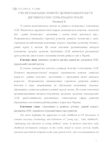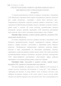 In the article, going are illuminated near babyhood in thedocuments of the UNO. A terminological vehicle over isbrought, a concept "junior age", "babyhood", "education andeducation of children of junior age", is determined.Розкрива¬of ються innovative strategies of development ofbabyhood in the world, survivals sent to providing, health,studies and development of child in an early period of herlife. On the basis of positions of the documents programs,projects, the initiated UNO, analysed by an author,recommendations are given in relation to development ofindustry of education and education of child of early age in Ukraine.