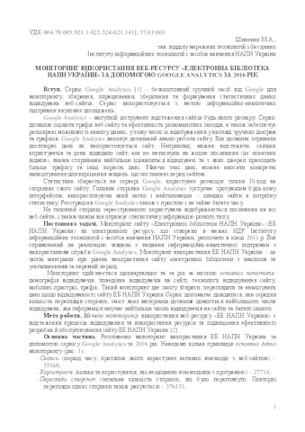 - Шиненко, М.А. (2017) Monitoring the use of the web resource "Electronic Library of the National Academy of Sciences of Ukraine" with the help of Google Analytics for 2016 In: Звітна науково-практична конференція Інституту інформаційних технологій і засобів навчання НАПН України . Інститут інформаційних технологій і засобів навчання НАПН України, м. Київ, Україна, pp. 121-127.