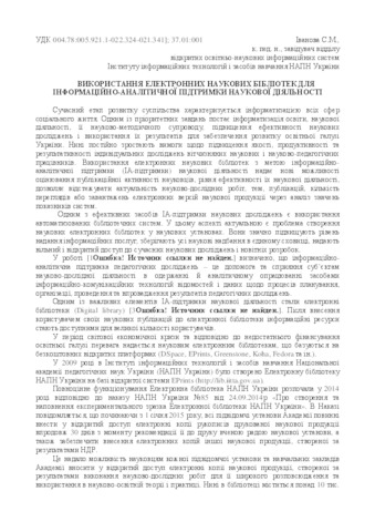 - Іванова, С.М. (2017) Use of electronic scientific libraries for informational and analytical support of scientific activity In: Звітна науково-практична конференція Інституту інформаційних технологій і засобів навчання НАПН України . Інститут інформаційних технологій і засобів навчання НАПН України, м. Київ, Україна, pp. 31-35.