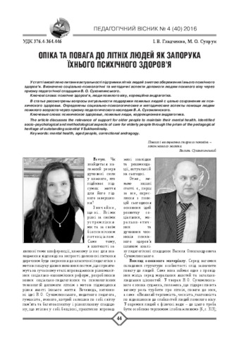 The article discusses the relevance of support for older people to maintain their mental health. Identified socio-psychological and methodological aspects of care for elderly people through the prism of the pedagogical heritage of outstanding scientist V Sukhomlinsky.