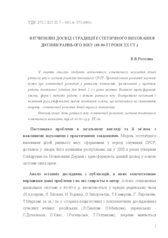 - Рагозіна, Вікторія Валентинівна (2014) Domestic experience and tradition of aestxetic education of child of ealy age (40-80-ies of XX century). Духовність особистості: методологія, теорія і практика, 4 (63). pp. 152-158.
