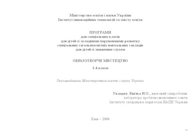 - Квітка, Н.О. (orcid.org/0000-0002-8885-1883) (2008) Programs for special classes for children with complex disorders of the development of special general educational institutions for children with hearing impairment. Art. Grades 1-4 [Teaching Resource]