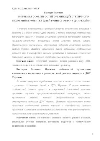 - Рагозіна, Вікторія Валентинівна (2014) A study of features of organization of aesthetically beautiful education and development of children of early age is in preschool establishments of Ukraine Проблеми підготовки сучасного вчителя, 10. pp. 231-240. ISSN 2307-4914