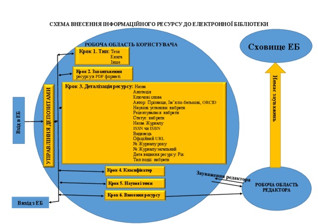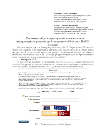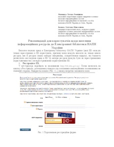 The recommendations describe the steps for user registration in the DL, the settings of the User's Deposit Management page, the preparation of a PDF resource format, a description of the deposit and the introduction of a resource, setting the user profile page in the DL. Only computer users registered in the Digital Library NAES of Ukraine can enter scientific works in the Electronic Library of Ukraine. They can contribute not only their own resources but also resources of other authors (for example, departmental staff) who wish to place their scientific works in the DL. These resource authors can be both registered users and unregistered users of the DL.