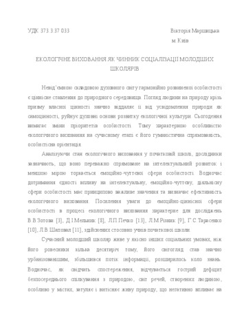 - Маршицька, В.В. (orcid.org/0000-0002-7072-8844) (2003) Ecological education as a factor of socialization of younger schoolchildren Збірник наукових праць. Педагогічні науки, 35. pp. 133-137.