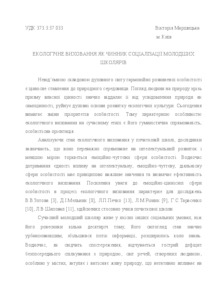 The peculiar features of ecological education of elementary school students are revealed as one of the important aspects of socialization of the individual; psychological patterns and mechanisms of formation of subjective attitude to nature.