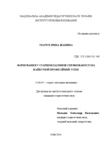 Dissertation for a scientific degree of PhD in pedagogy, speciality 13.00.07 – Theory and Methods of Education. – Institute of Problems on Education of the National Academy of Pedagogical Sciences of Ukraine, Kyiv, 2016. The work deals with formation of future career success orientation in senior students during vocational guidance. Through theoretic analysis, the essence of a senior’s future career success orientation is specified as a vector of his (her) vocational self-determination, which, on the basis of the formed own professional success image and an intention to meet the social-professional standard, determines the direction of individual organization and permanent self-regulation of own vocational guidance activity. The potential of vocational guidance in secondary schools is revealed in context of formation of seniors’ future career success orientation. Criteria, indices, and levels of seniors’ future career success orientation are developed and defined. Educational conditions of formation of future career success orientation in senior students are substantiated (activation of a senior’s cognitive-search sphere in order to coordinate his (her) personal development possibilities and social realization in a certain profession; organization of project-constructive vocational guidance activity through performing by seniors tasks according to the chosen profession standard; involving of senior students to vocational guidance issues solving, practical implementation of their emotionally attractive image of future career success; strengthening of a senior’s reflexive-regulative activity in order to form skills and qualities necessary for the organization, reflexing and regulation of own vocational guidance activity.