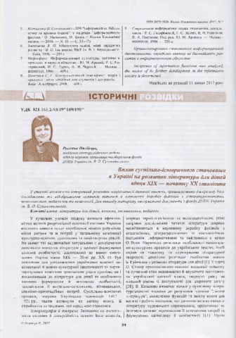 - Палійчук, Руслана Іванівна (2017) Influence of socio-historical situation in Ukraine on the development of literature for children the end of X IX - the beginning of XX century Вісник книжкової палати, 7. pp. 34-38. ISSN 2076-9326