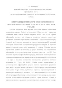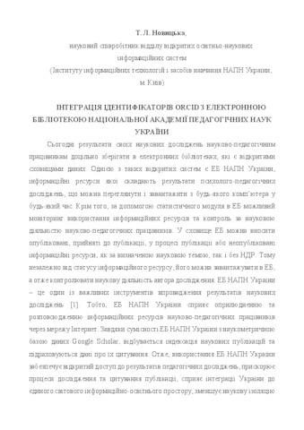 - Новицька, Т.Л. (orcid.org/0000-0003-2591-5218) (2017) Integration of IDs ORCID with the Digital Library NAES of Ukraine In: Науково-дослідна робота в системі підготовки фахівців-педагогів у природничій, технологічній і комп’ютерній галузях: матер. VI Всеукр. наук.-практ. конф. з міжнар. участю (13-15 вересня 2017 р., м. Бердянськ) . БДПУ, м. Бердянськ, Україна, pp. 162-164.