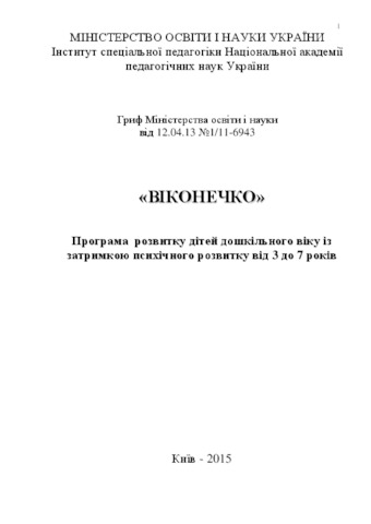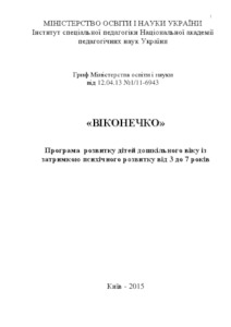 The program of development, training and upbringing of children of preschool age with delay of mental development "Viconechko" is the first component of scientific and methodological materials related to the modernization of the content of special preschool education in Ukraine and the humanization of its goals and objectives. The program reveals the essence of psychomotor, cognitive, speech, social development and peculiarities of the development of play, visual and constructive activity of children of preschool age with a delay of mental development. The main educational tasks are revealed, the content of pedagogical work is disclosed, advice is provided to parents, and the approximate results of educational work with preschool children with mental retardation of different age groups are determined. "Vykonechko" is the first state program of a new type, which reflects the requirements for the development, education and training of a child of preschool age with a delay in mental development. The program is intended for pedagogical workers of special preschool institutions, groups, educational complexes, parents, students and teachers of higher pedagogical educational institutions, which are concerned with the problem of training and upbringing of preschoolers with a delay of mental development.