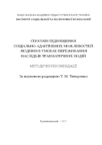 - Титаренко, Тетяна Михайлівна (orcid.org/0000-0001-8522-0894), Лазоренко, Борис Петрович (orcid.org/0000-0002-2113-0424), Ларіна, Тетяна Олексіївна (orcid.org/0000-0001-8975-3348), Дворник, Марина Сергіївна (orcid.org/0000-0003-1505-0169), Мирончак, Катерина Володимирівна (orcid.org/0000-0002-1378-0494), Савінов, Володимир Вікторович (orcid.org/0000-0001-5830-2333), Гундертайло, Юлія Данилівна (orcid.org/0000-0001-6959-663X) and Ніздрань, Олександра Андріївна (orcid.org/0000-0001-9676-9698) (2017) The ways of human social-adaptive possibilities increasing in the conditions of the consequences of traumatic events experience : methodical recommendations [Teaching Resource]