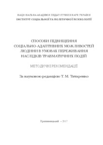 The recommendations, developed on the basis of the study on socio-psychological problems of affected by traumatic events persons, offer the technologies of socio-psychological rehabilitation and ways of personality’s psychological health retrieval; reveal the resources of personality’s viability, which ensure the construction of a full-fledged life in difficult conditions, and the means of these resources retrieval. In addition, there are considered the possibilities of mobile applications usage to overcome the consequences of psychotraumatization; the attention is also paid to the retrieval effect of the playback-theatre, which contributes to the socio-psychological adaptation after the trauma. There are also overviewed the available ways of the individual self-efficacy retrieval after experiencing the loss, as well as the ways of reintegrating problem youth into society. There are also described the technologies of provision of psychological help for internally displaced persons and burnout prevention of specialists who work with ATO participants. Addressed to psychology teachers in higher educational establishments which prepare practical and clinical psychologists, to employees of public and state rehabilitation centers, to assistance centers for vulnerable groups of population (including displaced persons), to military rehabilitation centers, to crisis intervention teams, to volunteer organizations, and to practical psychologists.