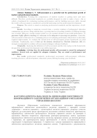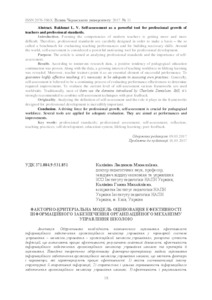 - Калініна, Л.М. and Калініна, Г. М. (2017) The factor-criterial model for assessing the effectiveness of information support for the organizational mechanism of school management Вісник Черкаського університету. Серія «Педагогічні науки», 11. pp. 18-36. ISSN 2076-586