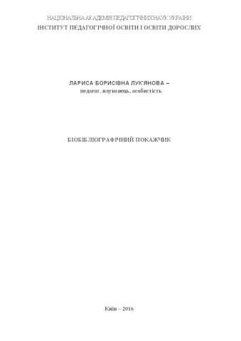 A biography bibliography contains a bibliography of life and activity of Larysa Borysivna Lukianova, Corresponding Member of the National Academy of Sciences of Ukraine, Doctor of Pedagogical Sciences, Professor, Honored Worker of Science and Technology of Ukraine. The scientific achievements of the scientist are presented: monographs, teaching aids, textbooks, concepts, programs, reference publications, articles in domestic and foreign collections, materials of scientific conferences and publications in periodicals on issues of environmental education, adult education, continuing vocational and pedagogical education, etc. . The index is intended for researchers, post-graduate students, doctoral students, engineer-pedagogical workers, students of institutions of postgraduate pedagogical education, employees of scientific and methodological centers and vocational education offices, educational libraries, students and anyone interested in the problems of the theory and history of pedagogy, the theory and methodology of adult education.
