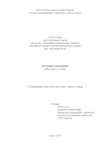 - Лапін, А.В. (orcid.org/0000-0003-1717-7892) (2006) Programs for special classes for children with complex violations of the development of special educational institutions for visually impaired children. Labor training. Preparatory, grades 1-4 [Teaching Resource]