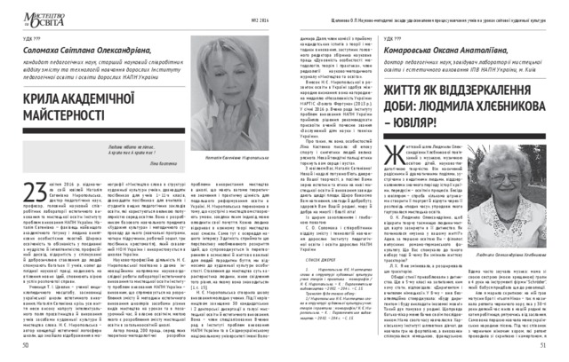 - Комаровська, О.А. (2013) Life as a reflection of the day: Lyudmila Khlebnikova - an anniversary! Мистецтво та освіта, 2 (2). pp. 51-55. ISSN 2308-8885