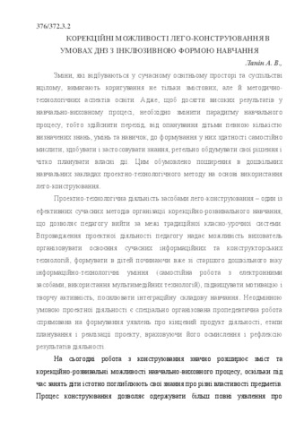 КОРЕКЦІЙНІ МОЖЛИВОСТІ ЛЕГО-КОНСТРУЮВАННЯ В УМОВАХ ДНЗ З ІНКЛЮЗИВНОЮ ФОРМОЮ НАВЧАННЯ.pdf Download (162kB) | Preview |