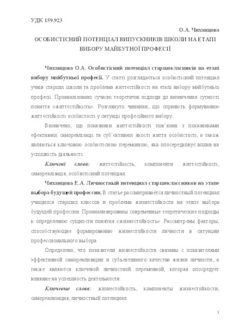 - Чиханцова, О.А. (2017) The personal potential of school-leavers on the stage of choosing a future profession Актуальні проблеми психології, 13 (6). pp. 182-187. ISSN 2072-4772