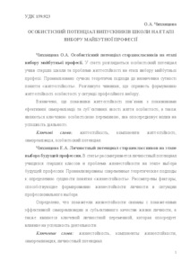 The article deals with the personal potential of school-leavers and the problem of viability to stage the choice of future profession. Analyzes contemporary theoretical approaches to defining the essence of the concept of ‘hardiness’. The factors that contribute to the formation of the individual resilience in situations of professional choice. Personal construction of hardiness design was an important factor in the confrontation, creating resistance to the effects of stress. Studies have shown that people have stable traits and do not give up easily under pressure, in the experience of suffering less stress. Hardiness is the psychological analogue of core human life, which reflects the extent of overcoming them given the circumstances, of itself, as well as the effort to work on themselves and over the circumstances of the life. Determined that the indicators of hardiness are related to the effective performance of selfreslisation and subjective quality of life of the individual and personality. They are a main variable that mediates the effect on the success of activity. Thus, we can say that hardiness is a part of an energy-saving strategy for achieving life goals, because the requirements, expectations, desires and hopes for lives and future in the way of self-fulfillment and self-realization of personality requires of a person to use all resources and adaptation mechanisms.